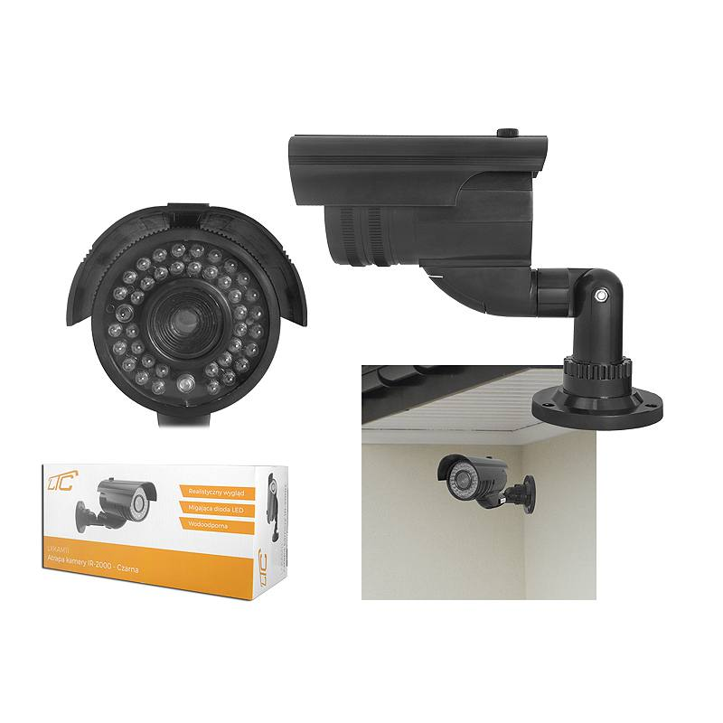 Atrapa kamery IR-2000, czarna.Profesjonalna atrapa kamery, której nie sposób odróżnić od prawdziwej kamery monitoringu. Atrapa wyposażona została w czerwoną diodę LED „nagrywania”, imitację diod IR oraz bardzo realistyczną atrapę obiektywu. Realizm tego urządzenia powoduje, że ma się wrażenie kontaktu z profesjonalnym sprzętem monitoringu.