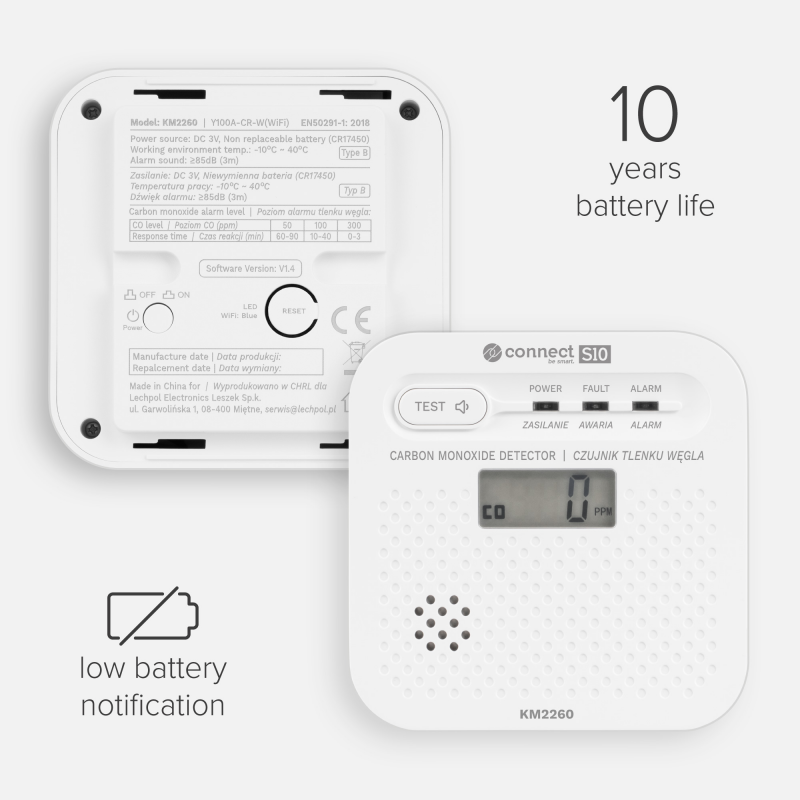 Czujnik został zaprojektowany tak, aby działać nawet przez 10 lat bez wymiany sensora. Energooszczędna praca i wydajna bateria oznaczają długie, bezproblemowe użytkowanie. To rozwiązanie, które montujesz raz i przez lata nie musisz się martwić o bezpieczeństwo swojej przestrzeni.
