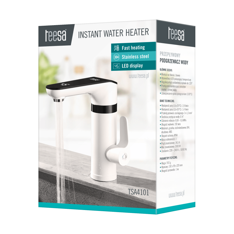 Przepływowy podgrzewacz Teesa sprawdzi się wszędzie tam, gdzie potrzebny jest szybki i wydajny dostęp do ciepłej wody bez konieczności stosowania dużych instalacji. Możesz wykorzystać go na działce, w domku letniskowym, garażu, a nawet w biurze. Urządzenie wyróżnia łatwy montaż na blacie lub zlewie, co umożliwia szybkie podłączenie do istniejącej instalacji wodnej i elektrycznej.