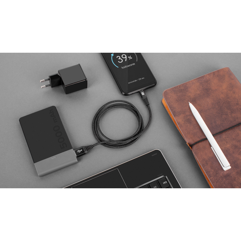 Kabel REBEL obsługuje standard USB 2.0, co umożliwia transfer danych z prędkością do 480 Mbit/s, co jest wystarczające do codziennego przesyłania plików, zdjęć i muzyki. Oprócz synchronizacji danych, kabel wspiera także szybkie ładowanie, kompatybilne z technologiami takimi jak USB Power Delivery (PD), MediaTek Pump Express, Quick Charge, Turbo Charge (Motorola), Adaptive Fast Charge (Samsung), Dash Charge (OnePlus), Super Charge (Honor, Huawei), a także Fast Charge dla urządzeń Apple. Dzięki temu kabel umożliwia szybkie i efektywne ładowanie różnorodnych urządzeń mobilnych.