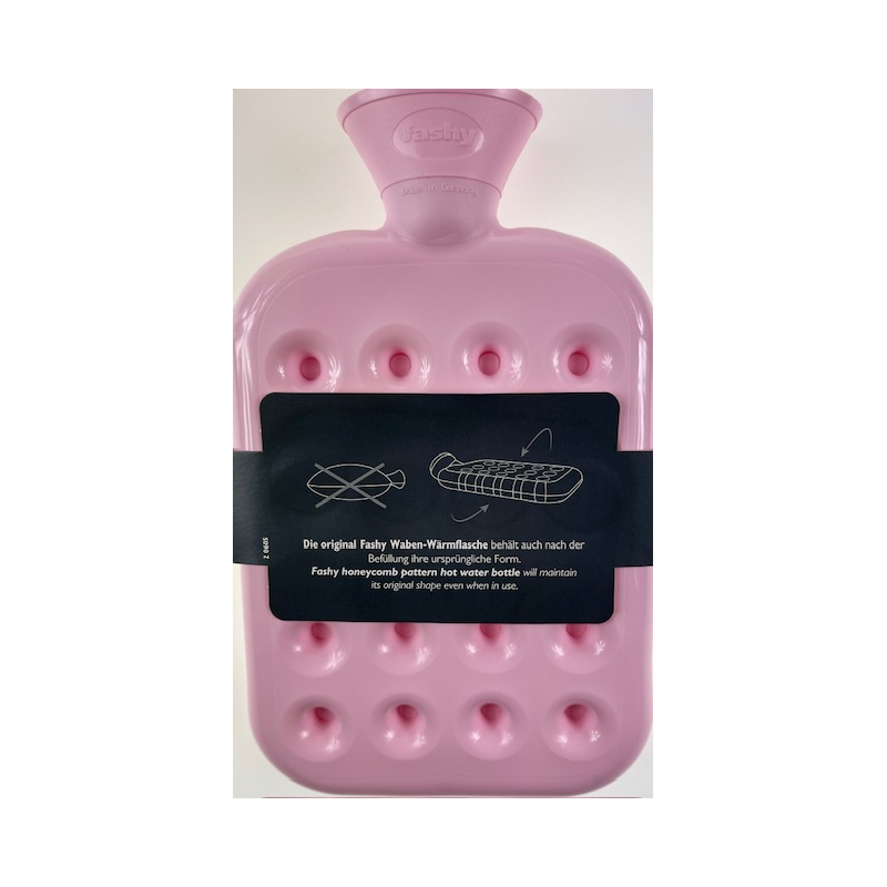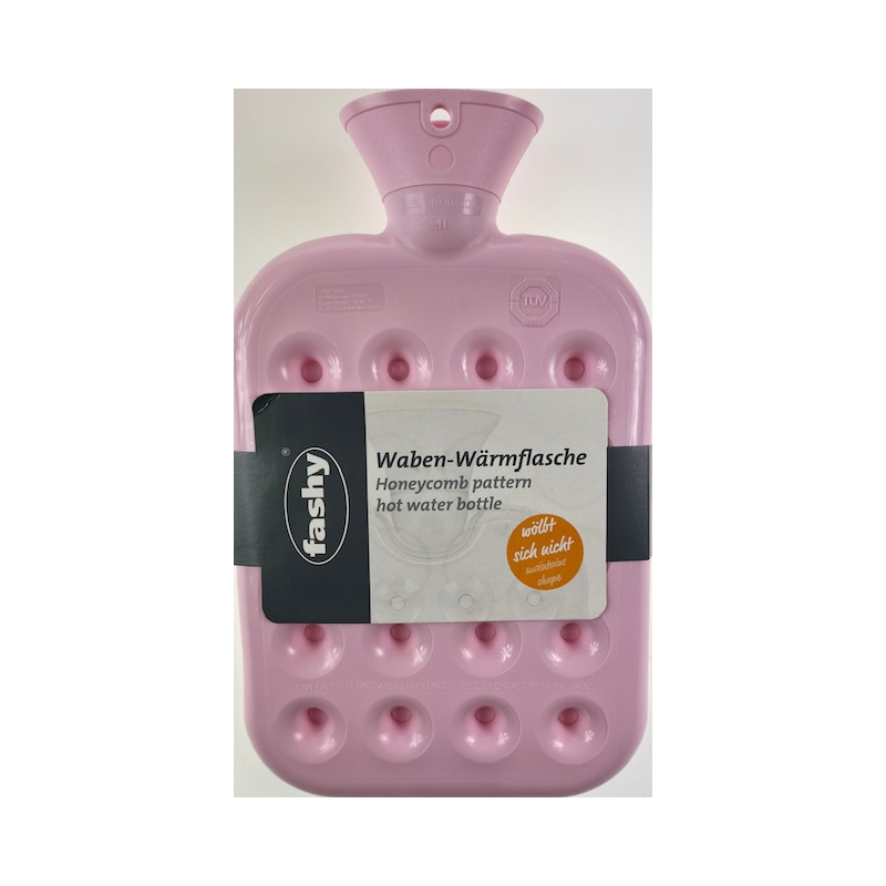 Prezentowany termofor jest wzorem opracowanym przez firmę Fashy, termofor ten charakteryzuje się specjalna budową w formie plastra miodu. Dzięki takiej konstrukcji termofor po nalaniu wody nie odkształca się i jest cały czas płaski. Pojemność termofora to 1,2l.